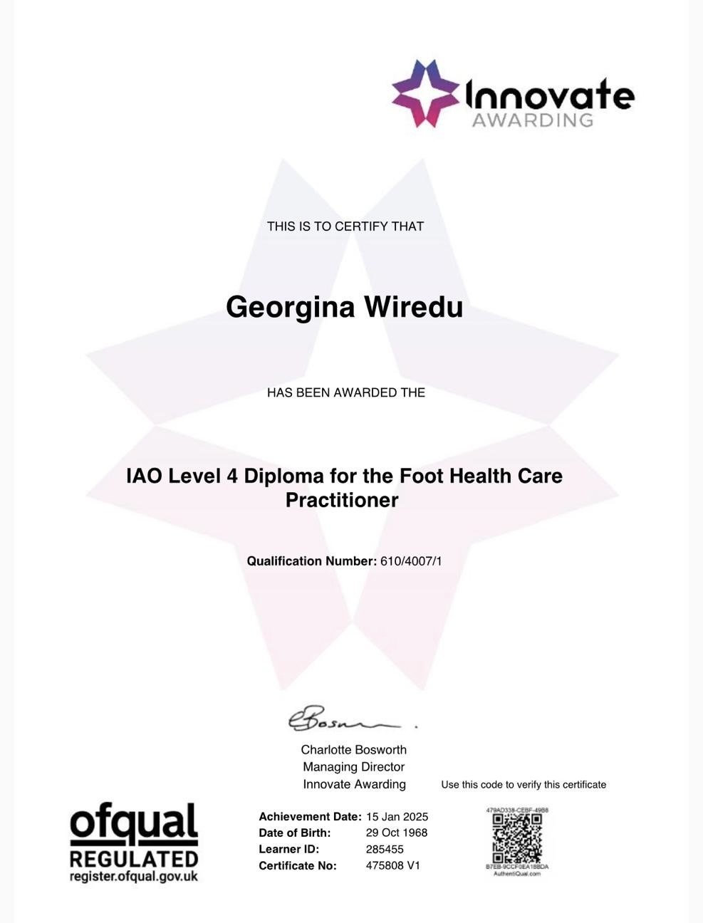 I’m insured, DBS checked, and hold a Level 4 Diploma in Foot Health Care. My treatments include nail cutting, diabetic foot care, ingrown nails, corns, fungal nails, cracked heels, and more.